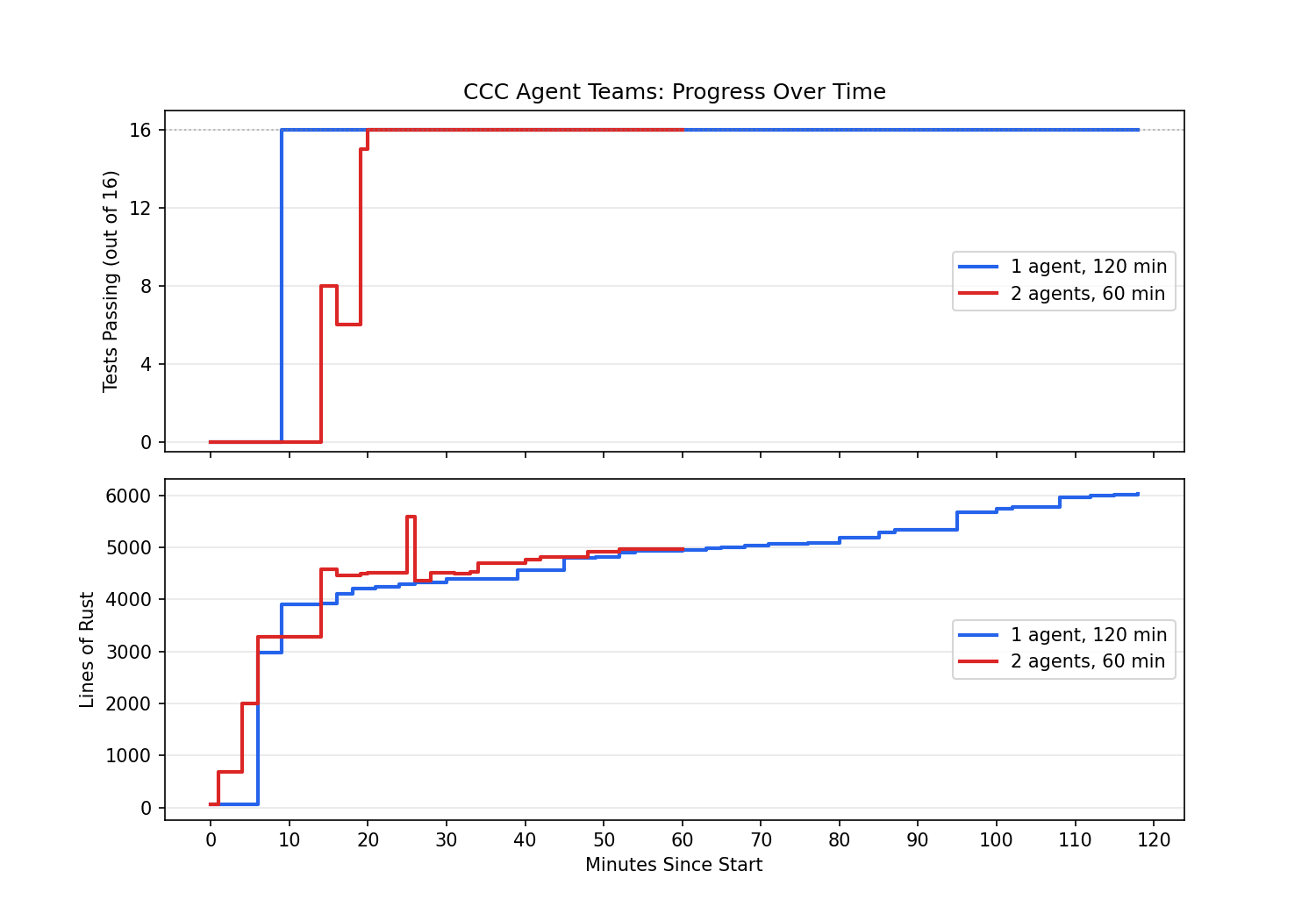 스캐폴딩을 시험하기 위해, 저는 1개 에이전트를 2시간 돌리는 경우와 2개 에이전트를 1시간 돌리는 경우의 효율을 비교하는 작은 테스트를 실행했고 결과는 아래와 같습니다. 두 실험 모두 fizzbuzz, 기본 재귀, 포인터, 배열, 구조체 등을 컴파일하는 16개 테스트를 통과하는 것이 목표였습니다. 재현된 스캐폴딩은 첫 20분 안에 이 테스트들을 통과할 수 있었고, 실제로는 1개 에이전트를 더 오래 돌린 실행이 더 많은 코드 라인을 생성했습니다. 따라서 병렬 에이전트의 효용에 대해서는 아직 결론을 내리기 어렵습니다.