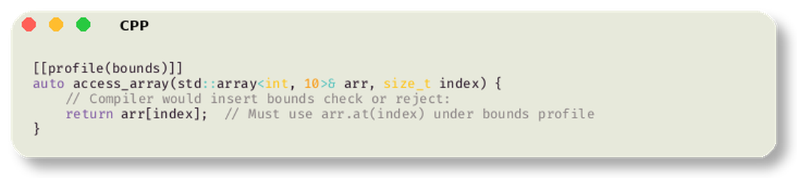 이게 단순히 코딩 가이드라인을 따르는 것과 뭐가 다를까? Profiles는 “권고”가 아니라 컴파일러가 강제하도록 설계되었다. 코드에 프로파일을 표시하면, 컴파일러가 집행자가 되어 해당 프로파일의 보장을 위반하는 코드를 컴파일 자체를 거부한다.