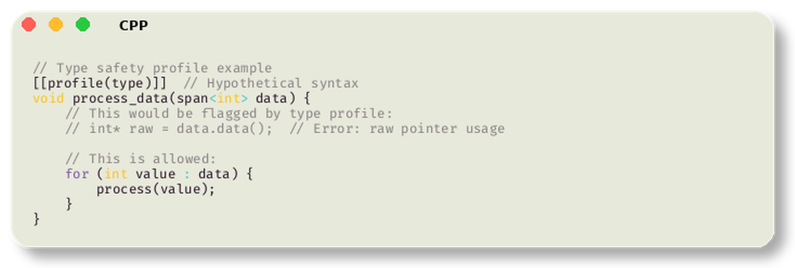 타입(type) 프로파일은 초기화되지 않은 변수, 위험한 캐스트, union 남용을 제거한다. 바운즈(bounds) 프로파일은 배열 범위 초과와 무분별한 포인터 산술을 막는다. 라이프타임(lifetime) 프로파일은—가장 야심찬 목표로—정적 분석으로 객체의 수명을 추적해 use-after-free 버그를 방지하려 한다.