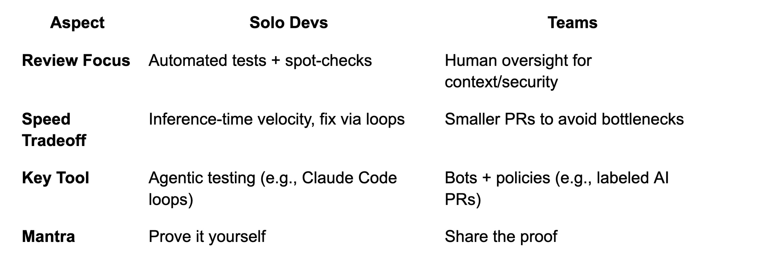여러 엔지니어가 협업할 때는 실수의 비용과 코드의 수명(장기 유지)이 훨씬 더 큰 이슈다. 팀은 PR에 대해 AI 기반 리뷰 봇으로 1차 패스를 돌리기 시작했지만, 여전히 사람이 승인해야 한다. Graphite의 Greg Foster가 말하듯 “나는 [AI 에이전트가] 실제 인간 엔지니어가 PR을 승인하는 것을 대체할 것이라고는 전혀 보지 않는다.”