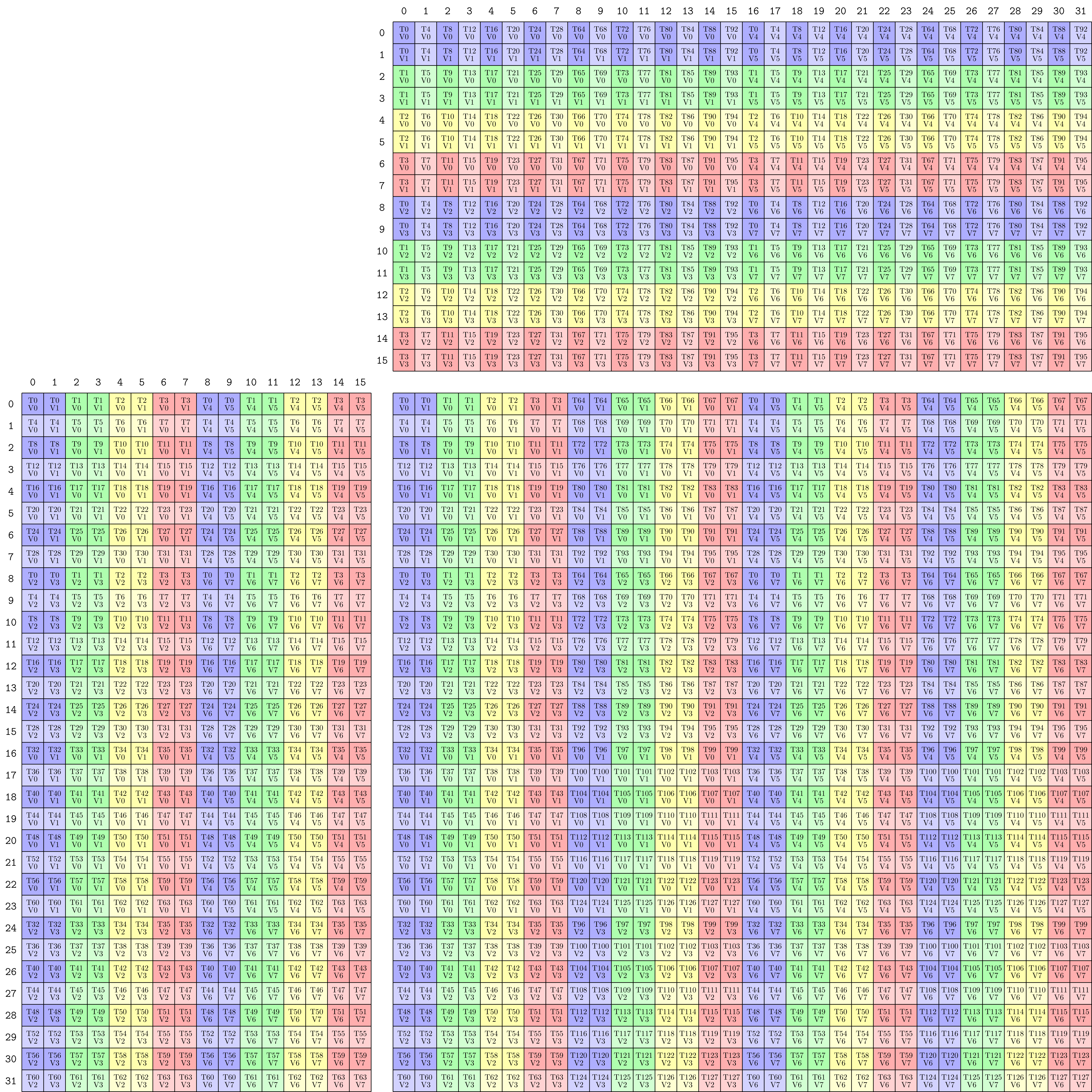 이를 다른 하드웨어 유닛에도 확장할 수 있다. 연산과 traits(메타정보)를 결합하면 MMA Atom이 된다. MMA Atom을 이용해 다음처럼 예쁜 그림을 출력할 수 있다.