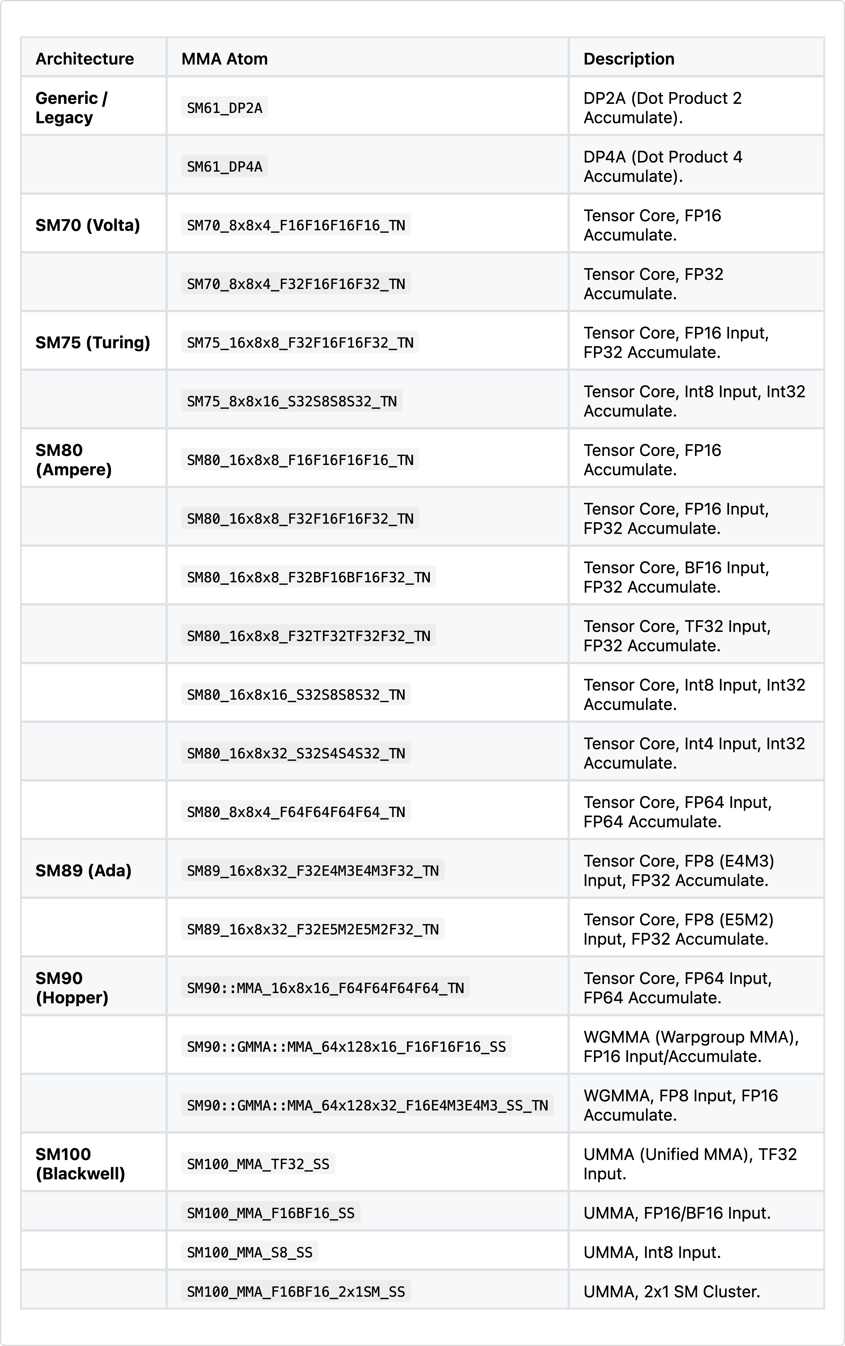 아래 표 4에는 MMA atom의 일부 목록이 있다. 패턴을 보면, MMA atom은 타일 shape 및 입출력 quantization으로 정의된다.
