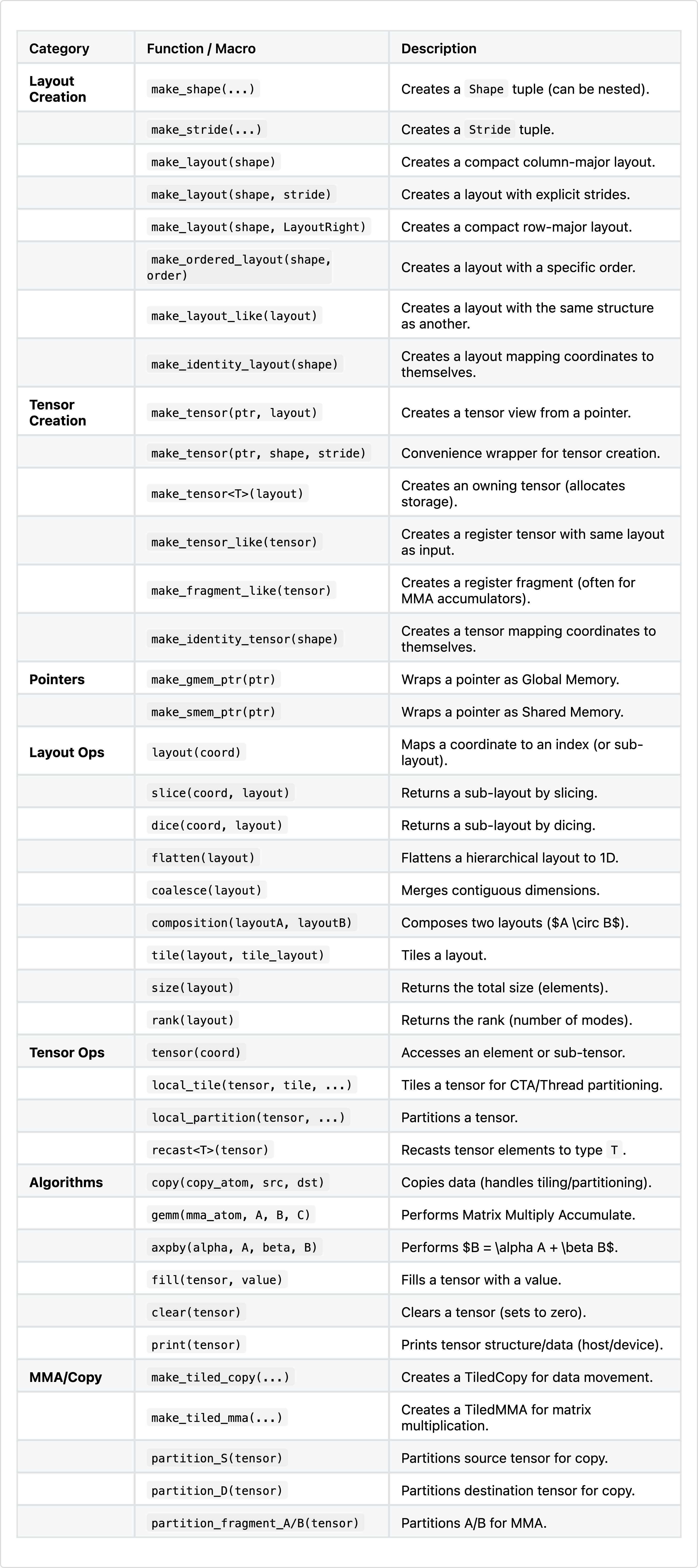 완전성을 위해 cute/layout.hpp와 cute/tensor.hpp에 있는 CuTe 핵심 API를 요약한다.