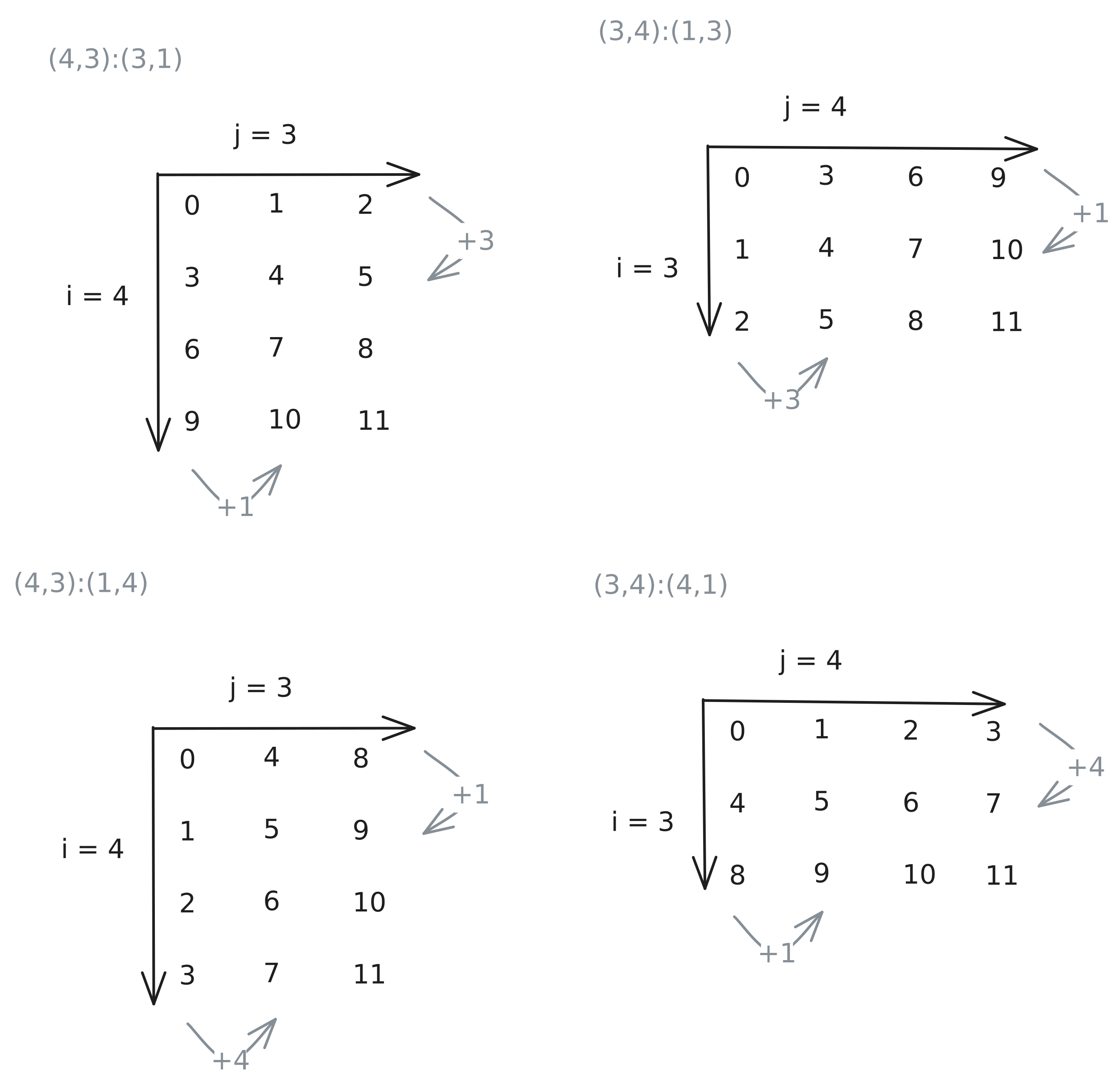 그림 2: CuTe 레이아웃과 인덱싱 패턴 — column/row major 4x3 및 그 전치 3x4.