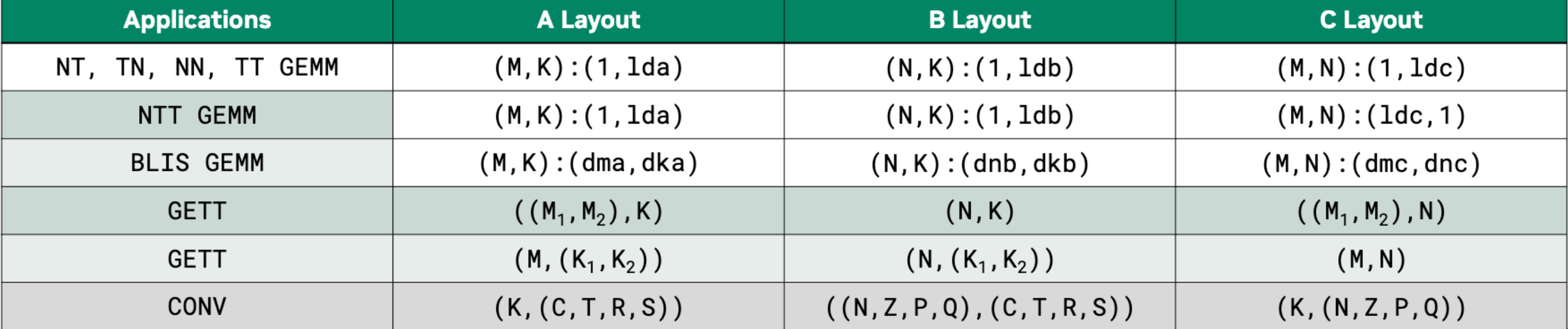 여기서 주인공은 Layout이다. Layout은 Shape(논리적 차원)와 Stride(요소 간 물리적 거리)로 구성된다. 이러한 Layout을 조작하면, 커널 코드를 다시 쓰지 않고도 복잡한 타일링/파티셔닝 패턴을 기술할 수 있다.