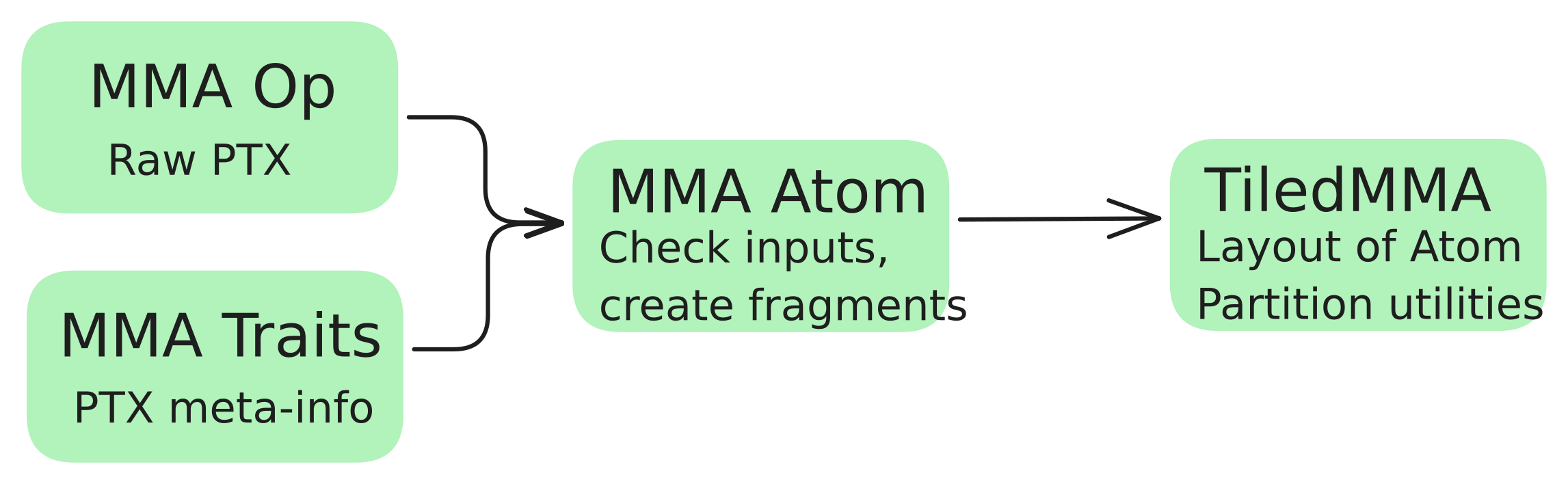 그림 6: MMA atom은 MMA 연산(PTX 명령)과 traits(요구 입력 shape)를 결합한 것이다. TiledMMA는 이를 중첩해 임의의 MMA 연산을 가능케 한다. Cris Cecka의 GPUMode Lecture 57에서 영감을 받음.