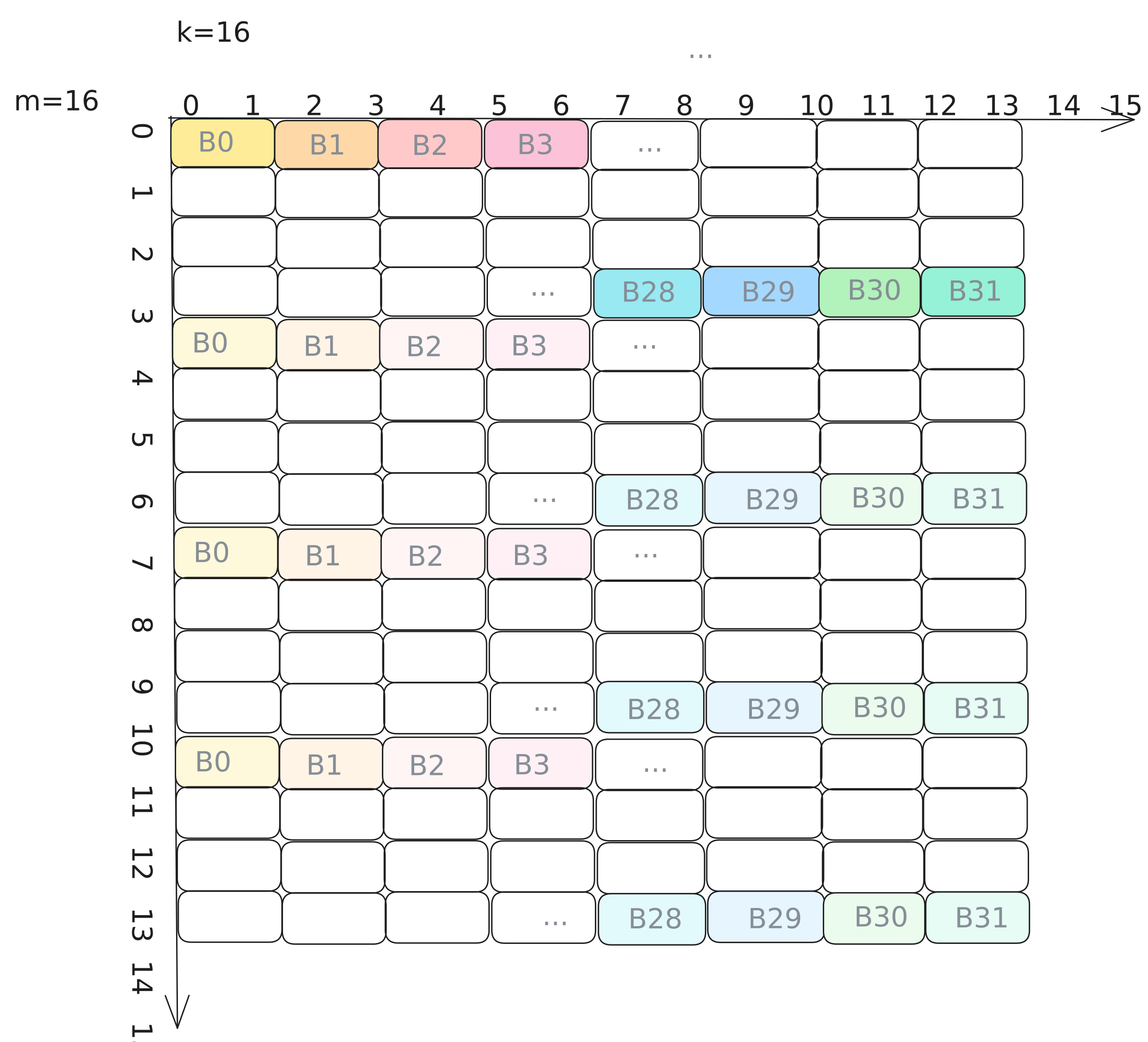메모리 처리량을 더 올리려면 벡터 명령을 사용해 한 명령으로 여러 값을 로드한다. 메모리 버스팅 관점에서 인덱스 계산/룩업 사이클이 줄어 더 빠르다. 벡터 명령을 쓰려면 원소가 메모리에서 128비트 정렬이어야 한다. A100에서 가장 큰 벡터 copy는 16바이트(.global.load.v4)이므로, K차원에 8개 스레드를 두고 각 스레드가 연속 8값을 처리하면 캐시라인을 최대 활용할 수 있다. 이 연속 8값이 16바이트 벡터 명령 1개가 된다. 워프의 나머지 스레드로 row들을 채운다.