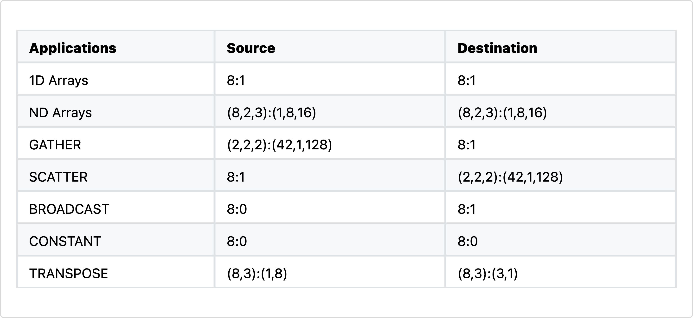 실제로 copy는 단순 복사 이상의 일을 할 수 있다. 전치(transpose), 집계(aggregate), 캐스팅(cast)도 가능하다. 예를 들어 브로드캐스팅은 “항상 0 위치를 가리키는 레이아웃”에서 “stride >= 1인 레이아웃”으로의 copy로 볼 수 있다. 아래 표에서 더 많은 아이디어를 얻을 수 있다.