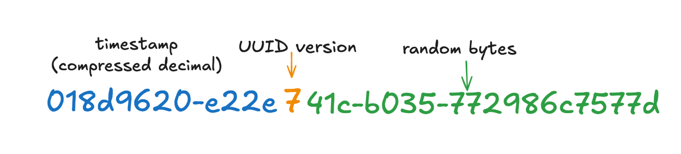 2024년 중반, 일련의 표준 업데이트를 통해 UUID v7 표준이 나왔습니다. 기존에 Postgres가 네이티브로 지원하던 버전은 UUIDv4였습니다. 하지만 큰 테이블에서의 정렬과 인덱싱은 높은 무작위성 때문에 성능 문제가 있었고, 인덱스 단편화와 낮은 지역성으로 이어졌습니다. UUIDv7은 이러한 정렬/인덱싱 문제를 개선합니다. 여전히 무작위성을 가지지만, 처음 48비트(16진수로 12자)는 타임스탬프이고 나머지 비트는 랜덤입니다. 덕분에 비슷한 시점에 삽입된 데이터는 지역성이 좋아져 인덱스 효율이 향상됩니다.