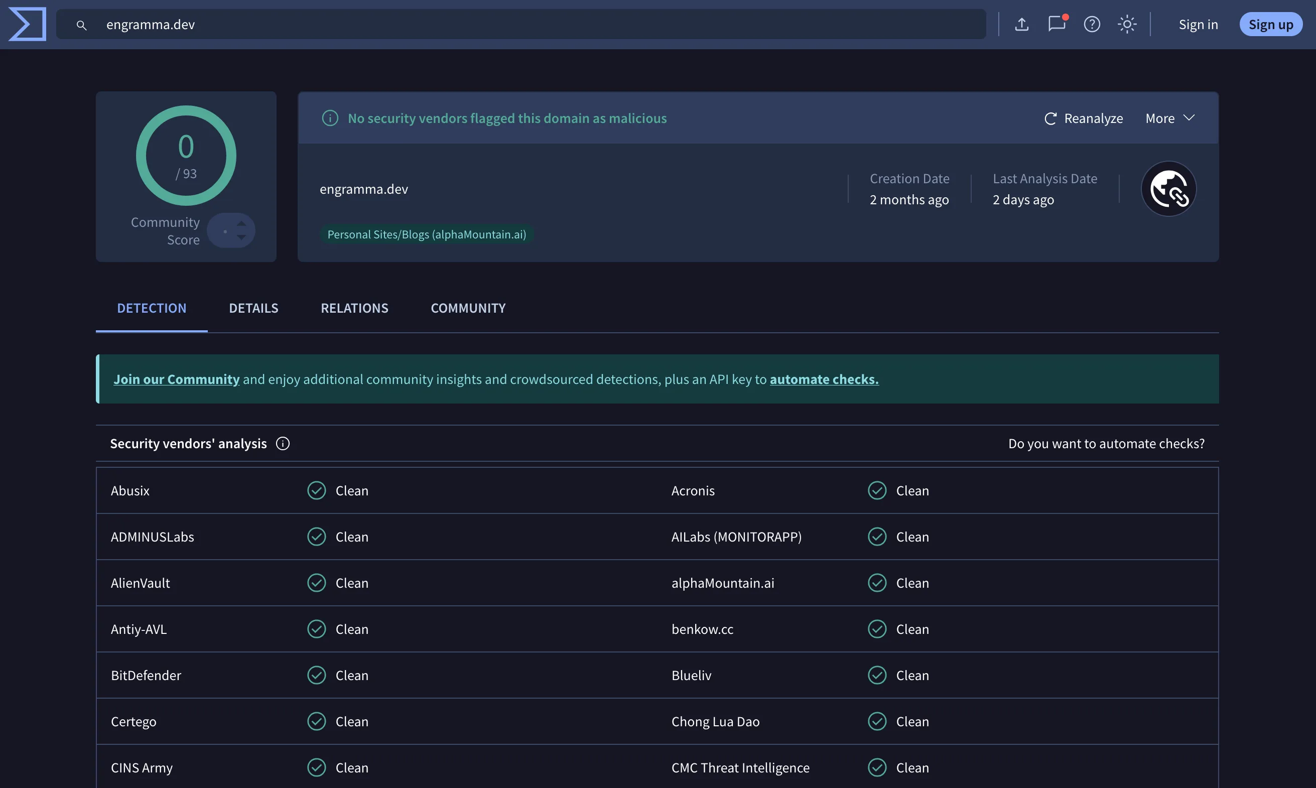 그래서 그대로 했다. VirusTotal 목록에 있는 모든 벤더를 찾아 하나씩 해제받고, 2주 뒤 다시 돌아갔다. 이번엔 수동 재스캔을 진행했고, 마침내 신뢰 점수(trust score)가 업데이트됐다.