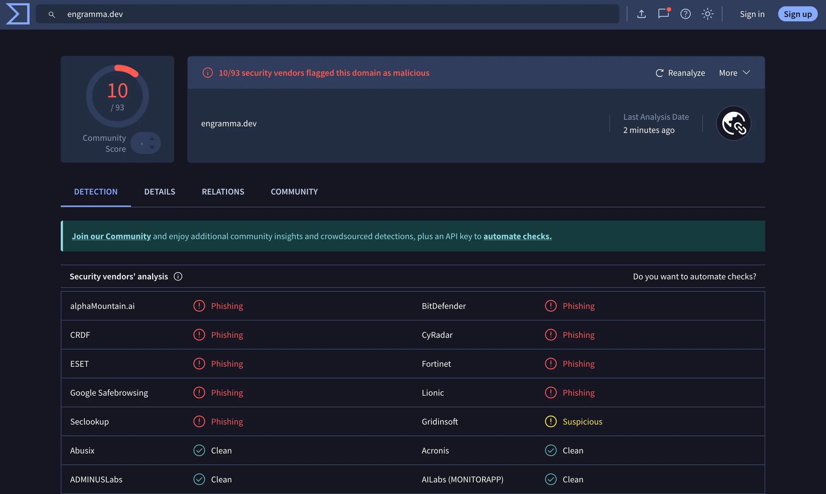그런데, 끝이 아니었다. 더 파고들어 보니 문제는 훨씬 심각했다. VirusTotal에서 확인해 보니 10개의 서로 다른 보안 벤더가 도메인을 악성으로 표시해 둔 상태였다.