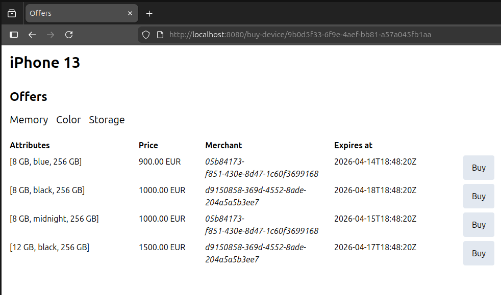 Details 또는 Buy 옵션을 클릭하면, 브라우저 url은 HTMX에 의해 표준 History API 를 사용해 변경됩니다. 동시에 HTMX는 각각 /devices/9b0d5f33-6f9e-4aef-bb81-a57a045fb1aa 또는 /buy-device/9b0d5f33-6f9e-4aef-bb81-a57a045fb1aa 로 GET 요청을 보냅니다. app id로 식별되는 HTML 요소의 내용은 서버에서 받은 HTML 조각으로 교체됩니다. 그 결과 전체 페이지 새로고침 없이 새로운 HTML 페이지를 보게 됩니다. 동작 방식은 전통적인, 클라이언트 중심 & JSON 지향 SPA 와 정확히 같습니다.