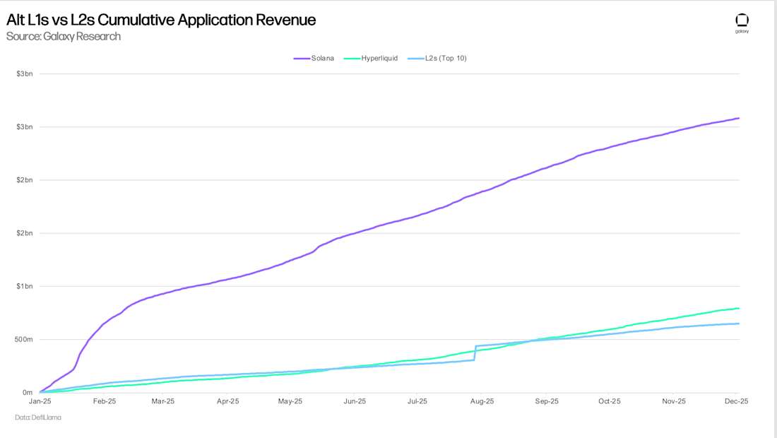 이 전망은 실현되지 않았다. 네트워크 및 애플리케이션 레벨 모두에서 L2는 선도 알트 L1 대비 전반적으로 부진했다. 솔라나는 사실상 소매 투기 체인으로서 지위를 강화하며, 트랜잭션 및 수수료 발생 활동에서 가장 큰 비중을 꾸준히 가져갔다. 동시에 Hyperliquid는 무기한선물 거래의 지배적 장으로 부상했고, 단독으로 L2 생태계 전체보다 더 큰 누적 애플리케이션 수익을 창출했다. Base는 알트 L1 수준의 견인력을 보인 유일한 L2로, 2025년 L2 애플리케이션 수익의 거의 70%를 평균적으로 차지했지만, 그 성장만으로도 솔라나와 Hyperliquid의 경제적 중력을 넘기에는 부족했다. – Lucas Tcheyan