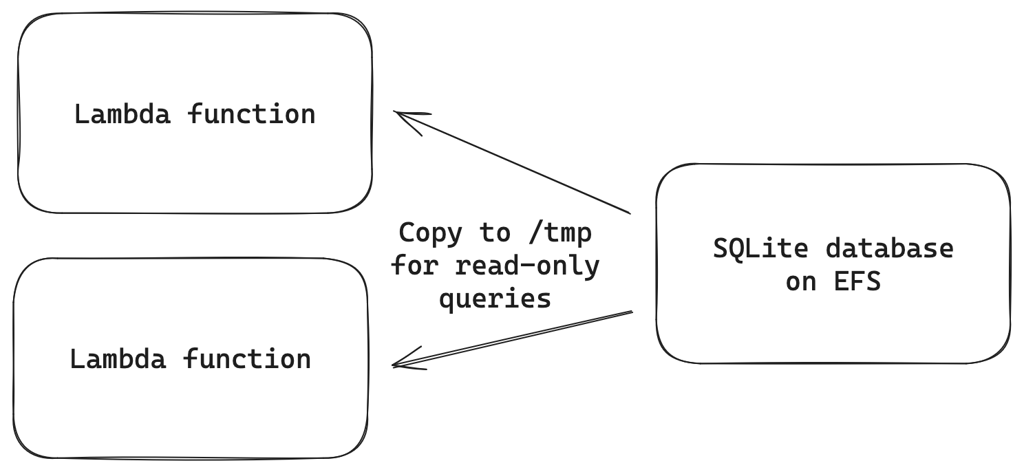 둘째, DB가 읽기 전용이지만 자주(매시간/매일) 업데이트된다면, 다른 해결책은 기본 DB를 EFS 볼륨에 두고, 시작 시점에 Lambda의 /tmp 디렉터리로 복사하여 훨씬 나은 성능(밀리초 대신 마이크로초)을 얻는 것입니다.