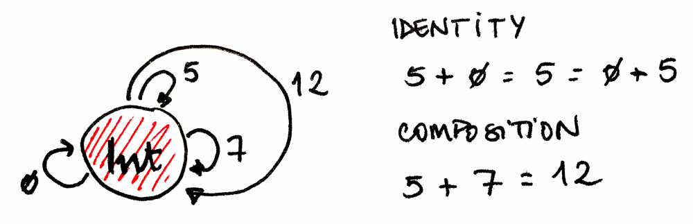 모노이드는 프로그래밍에서도 어디에나 존재합니다. 문자열, 리스트, 폴더블(foldable) 자료구조, 동시성 프로그래밍에서의 future, 함수형 반응형 프로그래밍에서의 이벤트 등등에 나타납니다. 예를 들어 모든 자연수를 나타내는 객체 하나와 5를 더하는 연산인 함수 f 하나를 떠올려보세요. 이 함수는 0을 5로, 1을 6으로, 2를 7로 매핑하는 식입니다. 이제 7을 더하는 또 다른 함수 g를 상상해봅시다. 일반적으로 임의의 수 n에 대해 n을 더하는 함수, 즉 n의 “adder”가 존재합니다. adder는 어떻게 합성될까요? 5를 더하는 함수와 7을 더하는 함수의 합성은 12를 더하는 함수가 됩니다. 즉 adder의 합성은 덧셈의 규칙과 동등하게 만들 수 있습니다. 좋은 점은 덧셈을 함수 합성으로 대체할 수 있다는 것입니다. 또한 중립 원소인 zero에 대한 adder도 있습니다. zero를 더하는 것은 아무 변화가 없으므로, 자연수 집합에서 항등 함수가 됩니다.