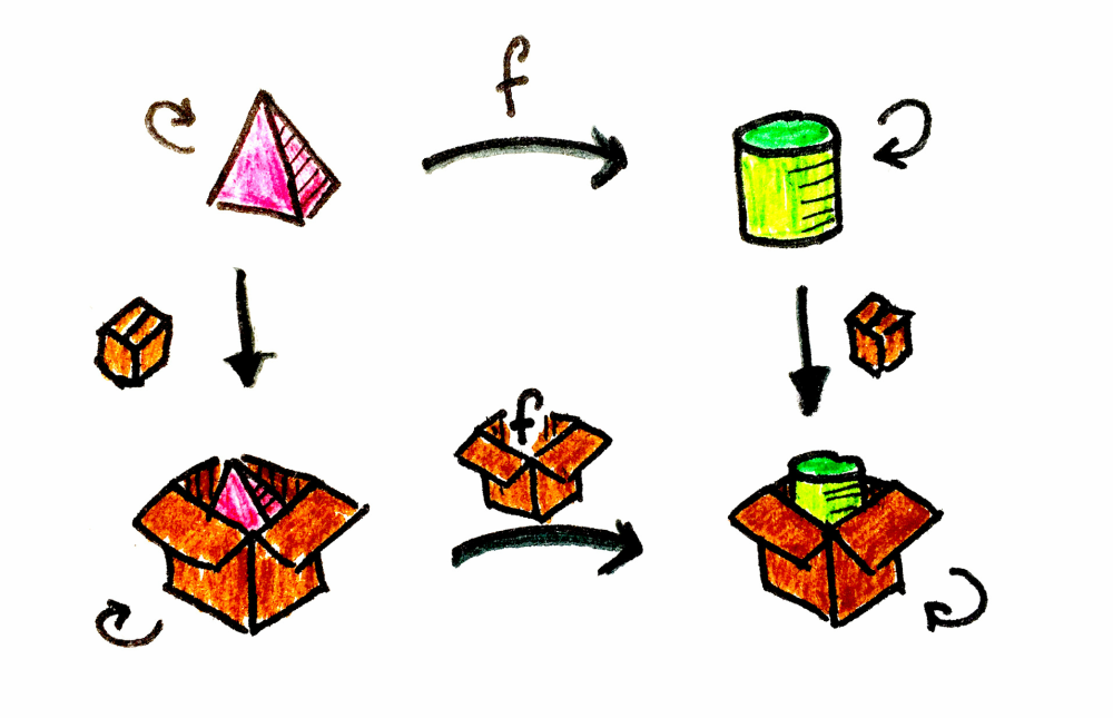 범주 C에서 피라미드를 원통으로 바꾸는 화살표가 f였다면, 이 새로운 범주에서는 이 화살표 f를 컨텍스트 F 안으로도 올려(lift) 둡니다(여기서 F는 컨텍스트이며, 우리 예시에서는 박스입니다).