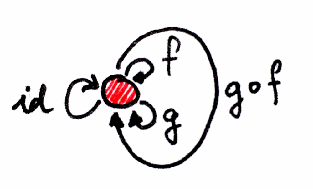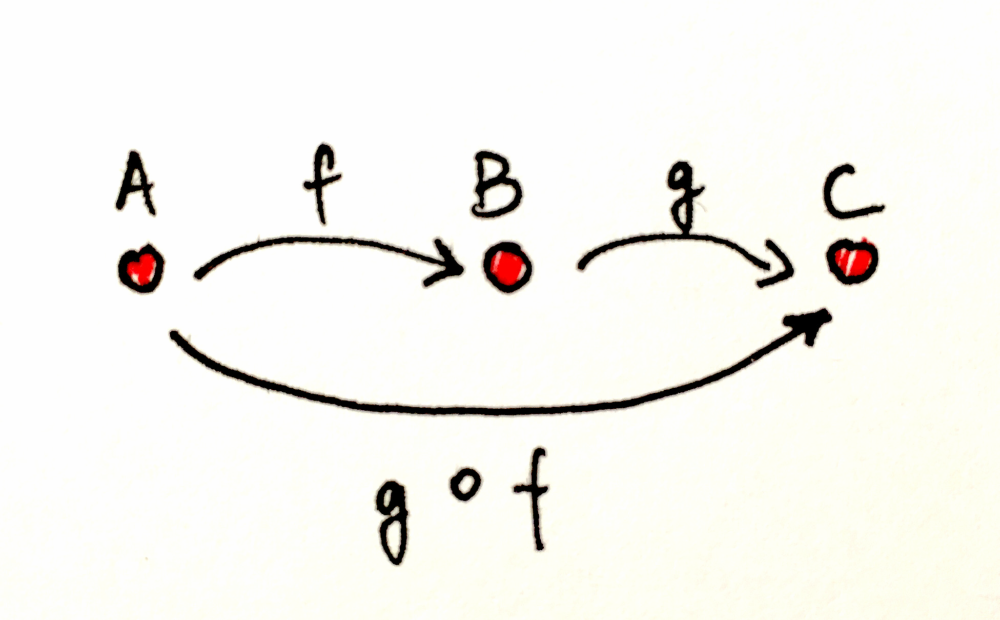 사상 f를 사용해 A에서 B로 갈 수 있고, g를 사용해 B에서 C로 갈 수 있다면, 암묵적으로 두 화살표의 합성인 g ∘ f(“f 다음 g”, g after f)를 통해 A에서 C로 갈 수 있습니다.