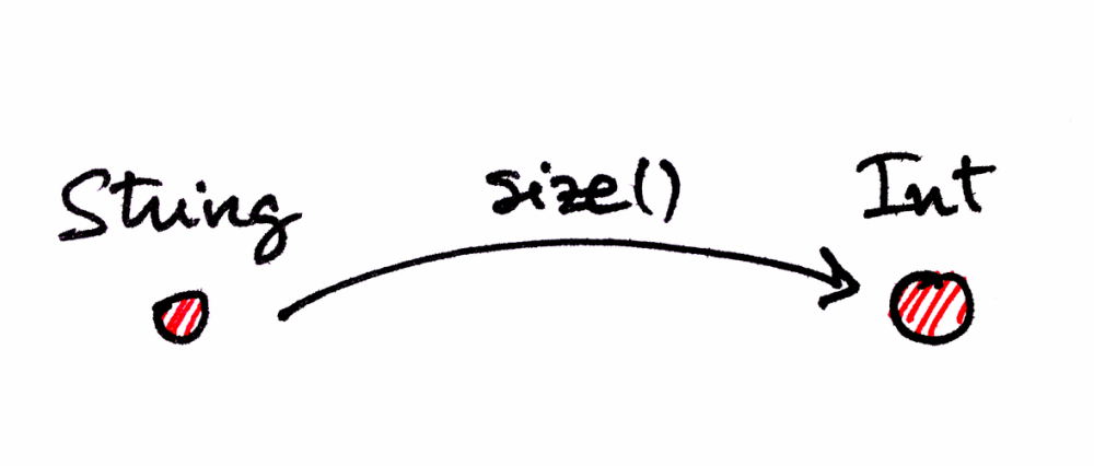 합성의 결합법칙을 이해하기 위해, 프로그래밍과 관련된 한 구체적인 범주에서 같은 개념을 보겠습니다. 객체가 데이터 타입(Int, String, Boolean 등)이고 사상이 함수인 범주를 생각해봅시다. 이 범주에서 size() 함수가 String과 Int 사이의 사상이 될 수 있을까요? 물론 가능합니다. String은 가능한 모든 문자열의 집합이고, Int는 (예를 들어) 자연수의 집합이니까요.