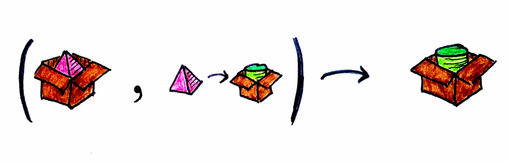 보시다시피 getPyramidFromDB는 피라미드를 주지만, 피라미드는 컨텍스트 안에 있습니다. 존재하지 않을 수도 있고(Option), 시간이 좀 걸릴 수도 있고(Future), 기타 등등 때문이죠. 하지만 getCylinderFromWS는 어떤 효과(effect)가 있는 피라미드를 기대하지 않고, 순수한 피라미드 자체를 요구합니다. “그럼 map을 써서 내용물을 조작하면 되지 않나?”라고 생각할 수도 있겠죠. 해봅시다.